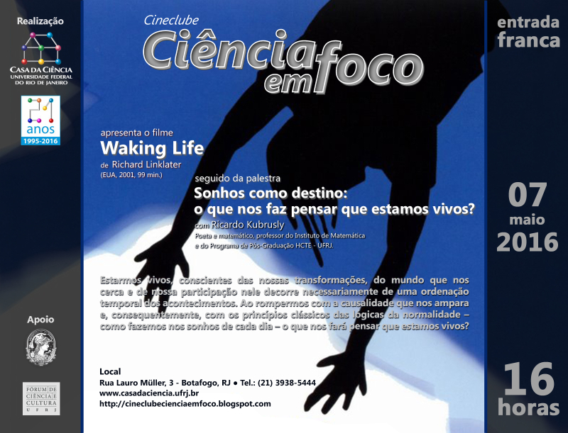 Exibiremos o filme Waking Life (E.U.A., 2001 – 99 minutos), de Richard Linklater, seguido da palestra Sonhos como destino: o que nos faz pensar que estamos vivos?, com Ricardo Kubrusly (poeta e matemático, doutor em Matemática pela University of Texas System, professor titular do Programa de Pós-Graduação em História das Ciências e das Técnicas e Epistemologia da UFRJ – HCTE/UFRJ).
