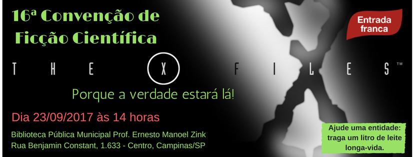 16ª Convenção de Ficção CientÃfica por Carol Suiter | 16/09/2017 - 11:44 |16/09/2017 ciência, cinema, cultura, eventos, ficção, jornada nas estrelas, nerd, scifibrasil, seriados, star trek, ufologia O evento terá mostra de episódios de séries cult, como Projeto UFO e Arquivo X, assim como um bate-papo com o escritor Acácio Brites e uma apresentação sobre a nova série Star Trek: Discovery, que estreia em setembro na Netflix. O bate-papo e a apresentação serão conduzidos por membros da Base Estelar Campinas e serão abertos para a participação do público. A entrada é franca, mas o grupo pede doação voluntária de leite longa-vida. O total arrecadado será entregue a uma entidade da cidade de Campinas. A doação não é obrigatória, mas as pessoas que fizerem doações concorrem a um sorteio especial. Sábado, 23 de setembro à s 14:00 – 18:00 UTC-03 Biblioteca Pública Municipal Prof. Ernesto Manoel Zink, localizada à Rua Benjamin Constant, 1.633, Centro, Campinas (SP) Tags arquivo x, base estelar campinas, convenção de ficção cientÃfica, projeto ufo.Adicionar aos favoritos o Link permanente.
