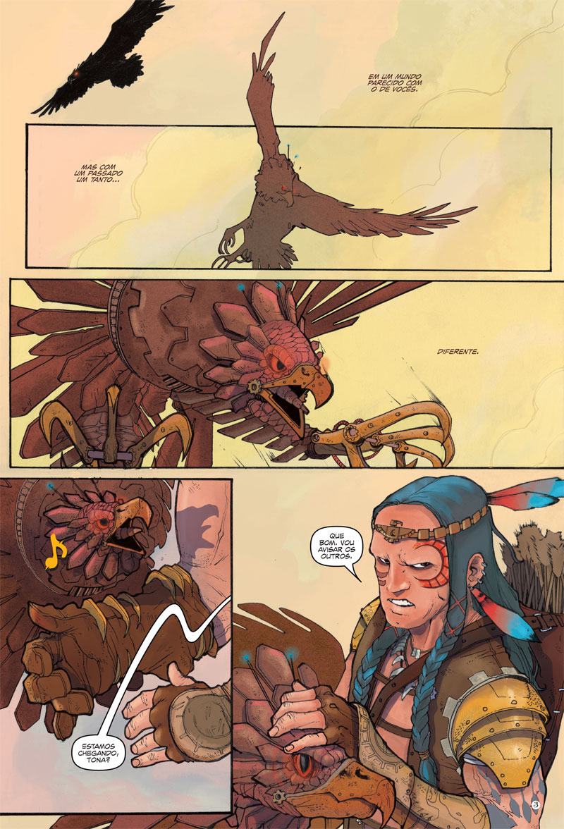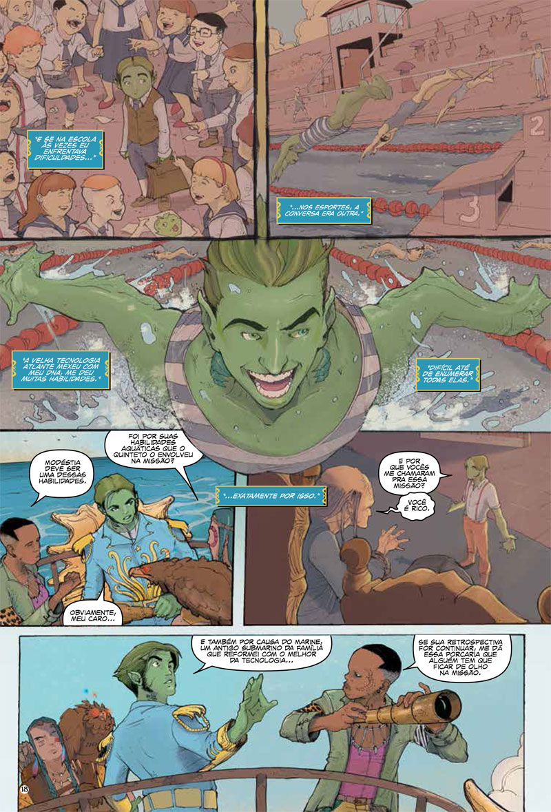 “Me convidaram pra brincar com os personagens deles. Aà eu acrescentei a Nay à equipe, fiz o roteiro e criei esse mundo onde a Atlântida não se foi por completo – e por isso a realidade evoluiu de maneira diferente, com essa mistura estética de fantasia e steampunkâ€, detalha Felipe.