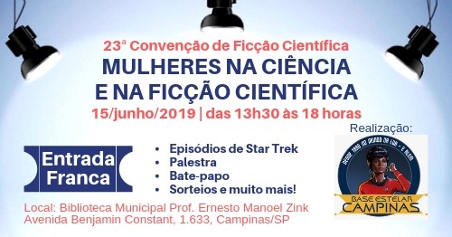 A Base Estelar Campinas, grupo de fãs de ficção cientÃfica, realizará sua 23ª Convenção de Ficção CientÃfica no sábado, dia 15 de junho de 2019, na Biblioteca Pública Municipal Prof. Ernesto Manoel Zink, localizada à Rua Benjamin Constant, 1.633, Centro, Campinas (SP). O evento é aberto ao público em geral, com inÃcio à s 13:30 e encerramento à s 18 horas.