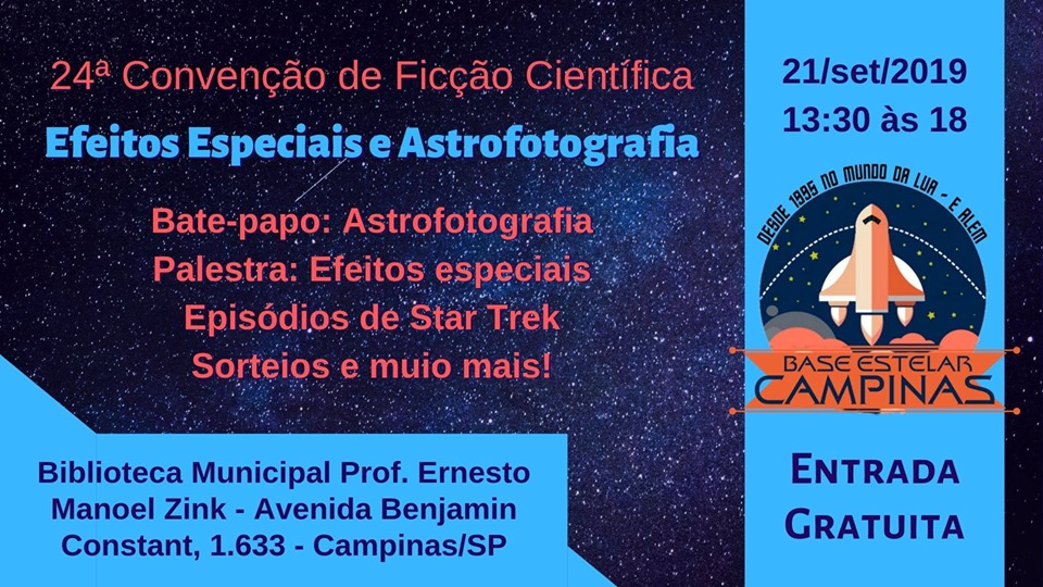 A 24ª Convenção de Ficção Científica da Base Estelar Campinas será realizada no próximo sábado, dia 21 de setembro, às 13h30, na Biblioteca Pública Municipal Prof. Ernesto Manoel Zink. O evento é gratuito e aberto ao público.